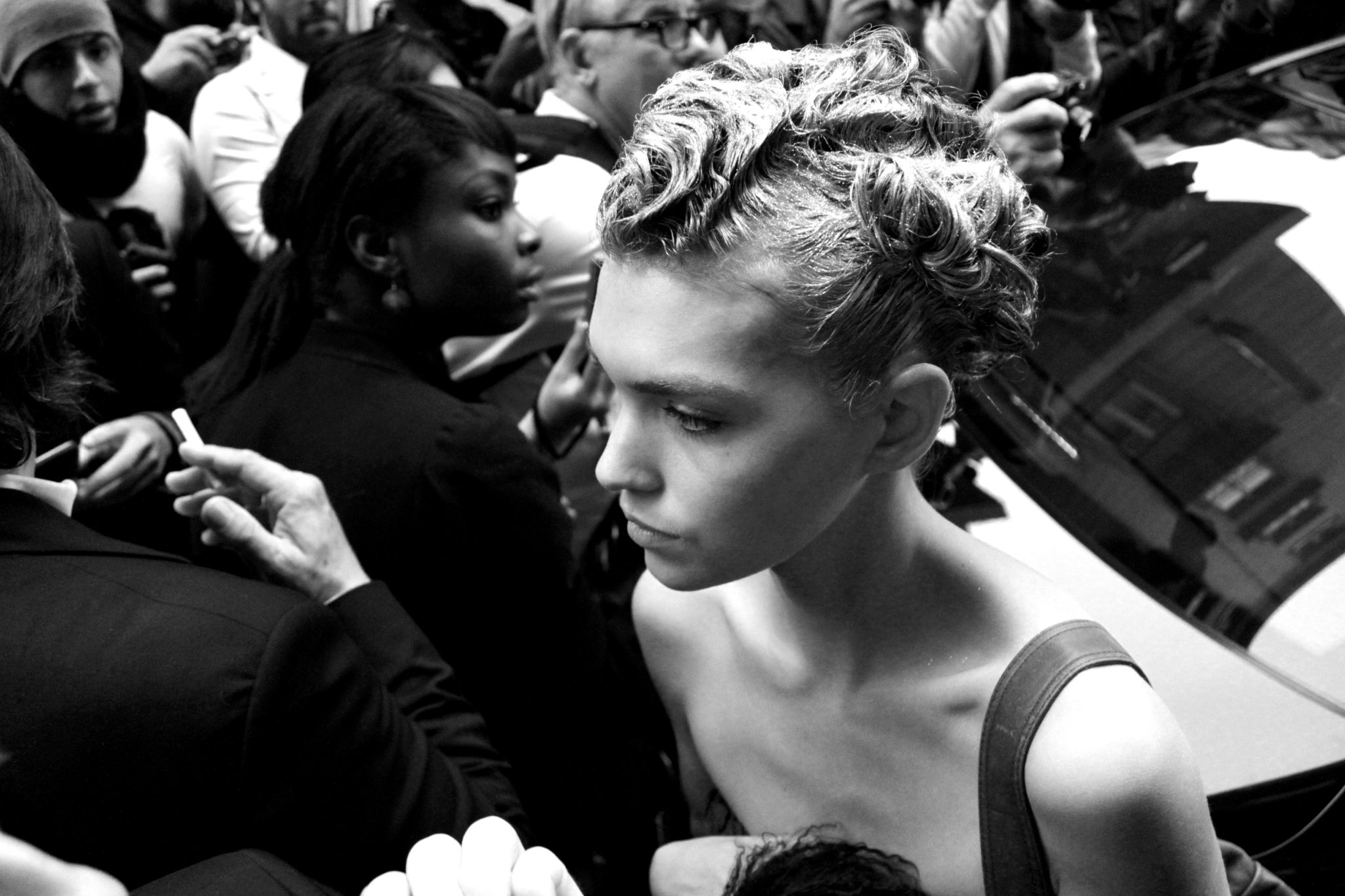 Elles sont déjà une poignée à être sortie du défilé Galliano. Les premières sont parties en courant sur leurs talons. Elles ne se retournent pas aux cris des fans, aux saluts des derniers maquilleurs à quitter les lieux. Elles sont en retard, un autre couturier les attend. La plupart d’entre elles sont encore maquillées, leurs cheveux, comme passés à la bombe argentée ou dorée, conservent intacts des séries de boucles travaillées. Les suivantes s’arrêtent un instant pour les photographes amateurs et blogueurs mode présents, avant de glisser un “thanks” discret. D’autres se calfeutrent derrière leurs lunettes de soleil et leur main brandie devant leur visage. Dans la petite rue sur laquelle s’ouvre la porte de la sortie des artistes, elles se frayent un chemin et atteignent le boulevard au pas de course, téléphone à la main, cherchant du regard la voiture diligentée par leur agence, le motard qui les coiffera d’une charlotte et d’un casque. Puis, le départ de Janet Jackson est annoncé. Sa voiture, fenêtres fumées, stationne devant l’entrée. Les photographes d’agence hurlent pour faire dégager le périmètre, pour que tout le monde recule, pour que les agents de sécurité libèrent le champ de vision, les fans sautent sur place, téléphones et appareils en main. Et elle apparaît, elle devance de quelques pas à peine la star tant attendue. Il fait chaud en ce début octobre, elle ne porte pas grand chose. Son frêle buste la hisse au-dessus de tout le monde. Elle jette quelques coups d’oeil pour se frayer un passage. En vain. Elle n’a pas le choix, elle doit rejoindre le haut de la rue à contre courant de la foule. Mais Janet Jackson arrive, l’étau se resserre, elle ne peut plus avancer, manque de tomber contre ces gens qui ne la voient même pas, semble-t-il. Le buste en avant, elle fend tant bien que mal la masse de plus en plus compacte. La traversée est interminable. Le pression grandit, emportée, elle recule de quelques pas. Parvenue à se libérer de cette étreinte collective, elle redevient l’objet de toutes les attentions des quelques fans qui réclament une photo à ses côtés, un regard. Cette femme frêle, au sourire timide, je l’apprendrais plus tard, s’appelle Arizona Muse (photo ci-dessus). Elle est une égérie de la mode. Du catwalk à la rue, ces femmes sont tout et rien. Choisies parmi des centaines d’autres, maquillées, coiffées, manucurées, habillées, encouragées, elles sont indispensables à la mode et doivent dans le même déhanché s’effacer derrière la création qu’elle présente le temps d’un défilé. Objet de l’admiration des amoureux des backstages ou femme bringuebalée entre les coups de coude des photographes amateurs, elles oscillent entre la lumière des projecteurs et l’éclat parfois cruel de la rue.